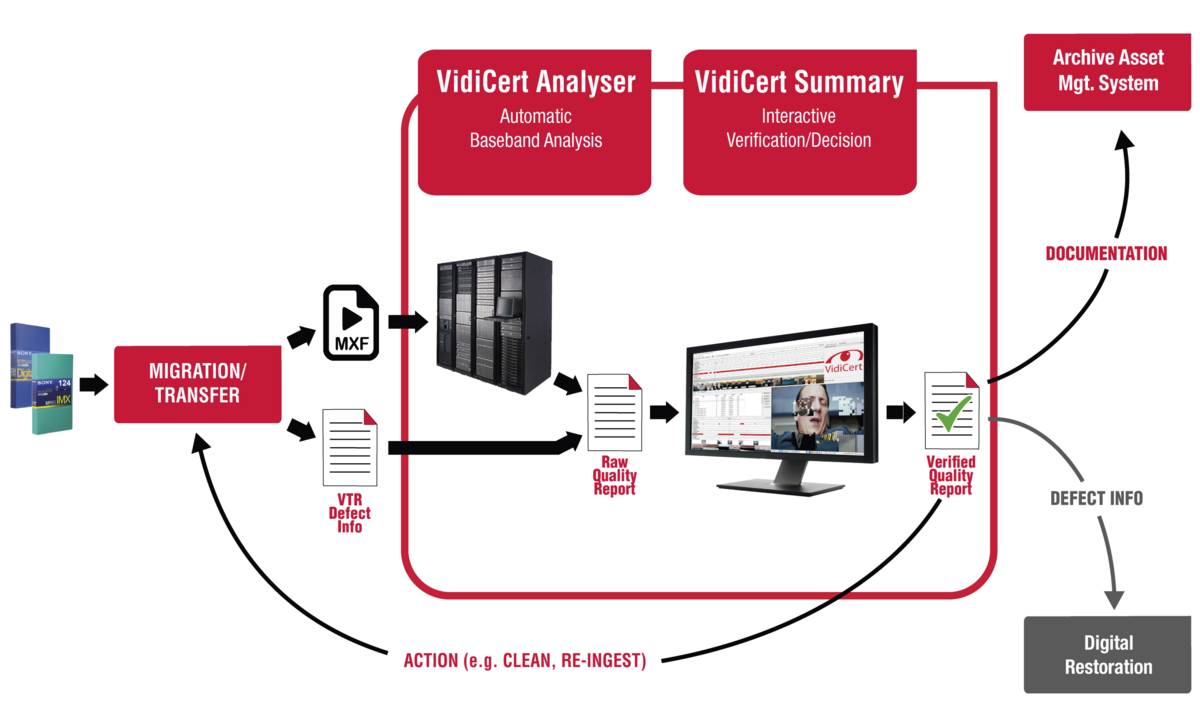 Video tape is digitised to file, either with a robotised or a manual ingest solution, either by you or by a service provider. The digitized file is analysed by VidiCert thoroughly and automatically in respect to specific visual and audio digitisation defects. Information about the location and severity of errors detected by VidiCert Analyser and optionally VTR-based error information is presented to the QC operator for verification. Verification of analysis results is highly efficient, enabled by the concise temporal information for segments with defects. So the operator can quickly decide, whether actions (e.g. cleaning of tape, cleaning of VTR, or re-ingest on an alternative VTR) need to be carried out. In case the digitisation is accepted by the operator, all defect information and any additional information provided by the operator during the verification process is documented for future use. This might be exported as XML, PDF or a restoration-report.”